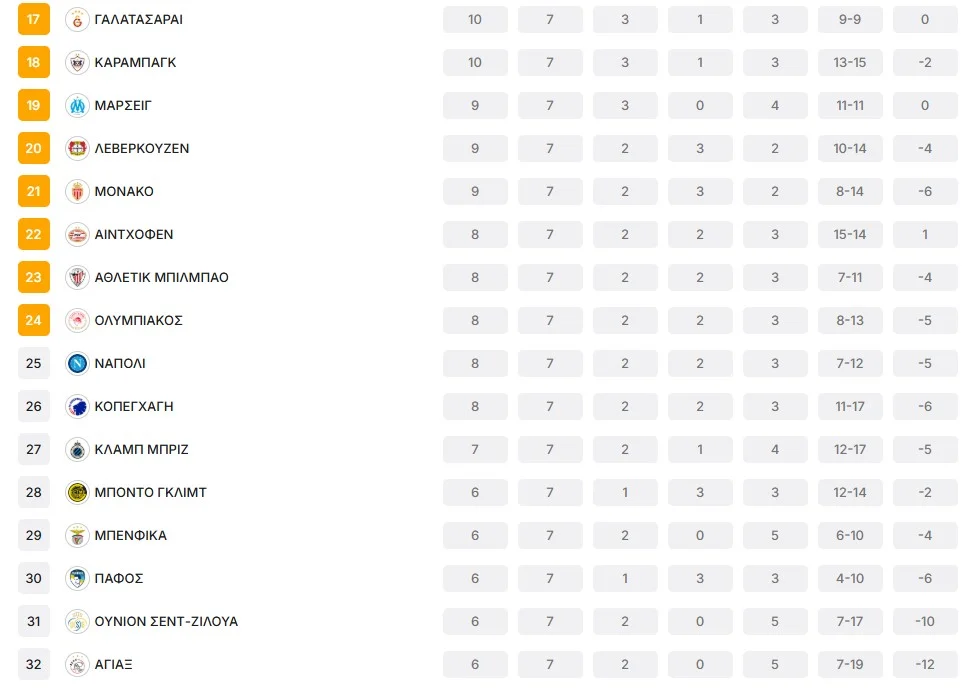 Αυτό που πρέπει να γνωρίζετε για αρχή είναι οι ομάδες που την ακολουθούν στη βαθμολογία τσάμπιονς λιγκ. Αυτή τη στιγμή συναντάμε τον Ολυμπιακό στην 24η θέση της League Phase με οκτώ πόντους και τον ακολουθούν οκτώ ομάδες.