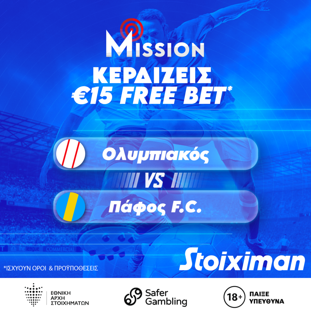 Stoiximan Mission με Super Έπαθλο* €15 Free Bet στο Ολυμπιακός Πειραιώς-Πάφος